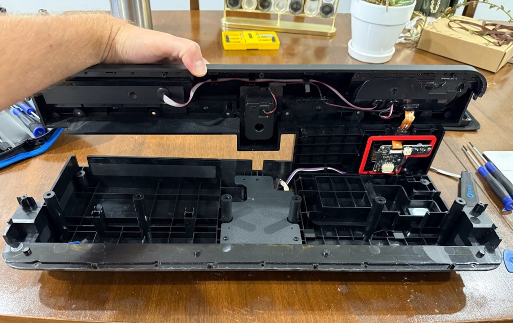 To split the Function Panel apart, there were ~19 total screws that I needed to remove. At that point, I was able to work a pry tool and guitar picks between the two halves. I worked my way all the way around, cracking open the plastic retaining clips as I went. This part wasn’t easy and I definitely mangled some of the edge by forcing the tools in. The guitar picks were helpful to keep split areas open while I worked around the edges.