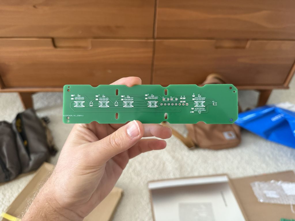 I was so excited to have found this solution. It was even better than my original idea and only used two wires! This resistance matrix solution worked for a while on the bench, but unfortunately, trying to solder leads onto the SMD components with a soldering iron did not prove to be very reliable (shocker, I know). The joints were all cold and some even fell off as I tried to tape them down and close everything up. After only a couple days, the readings on my test setup had become so inconsistent that they weren’t usable at all. The voltage wasn’t returning to the expected values and sometimes buttons weren’t registering at all. It was around this time that I decided to start again from scratch. I was going to design my own custom PCB instead.
