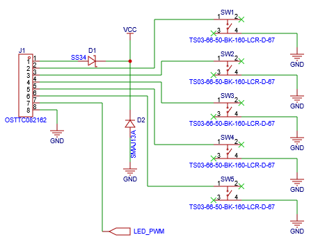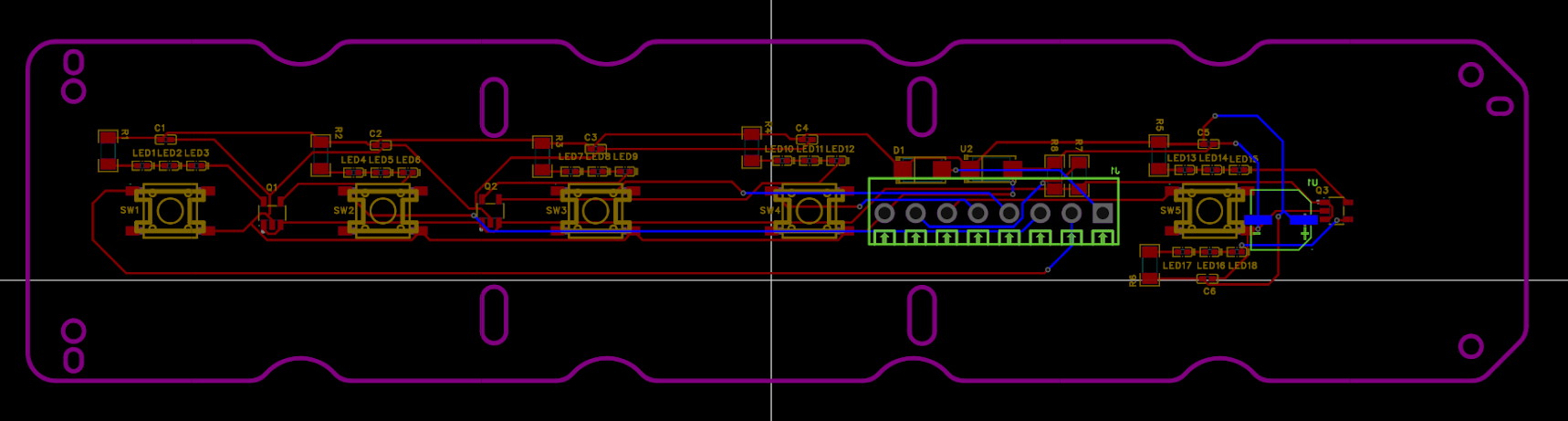 In OnShape, I used the 3D model to create a drawing which contained the outline of the board and the mounting hole cutouts. I imported the .dwg file into EasyEDA (not a sponsor) and moved it to the outline layer. From there, I searched though the standard parts catalogue of JLCPCB (also not a sponsor) to find switches that were approximately the same footprint as the originals. I also found a relatively low profile terminal block and a handful of other components intended to work as a backlight for each switch. I won’t spend much time writing about this process, but the schematic and PCB layout are shown below:
