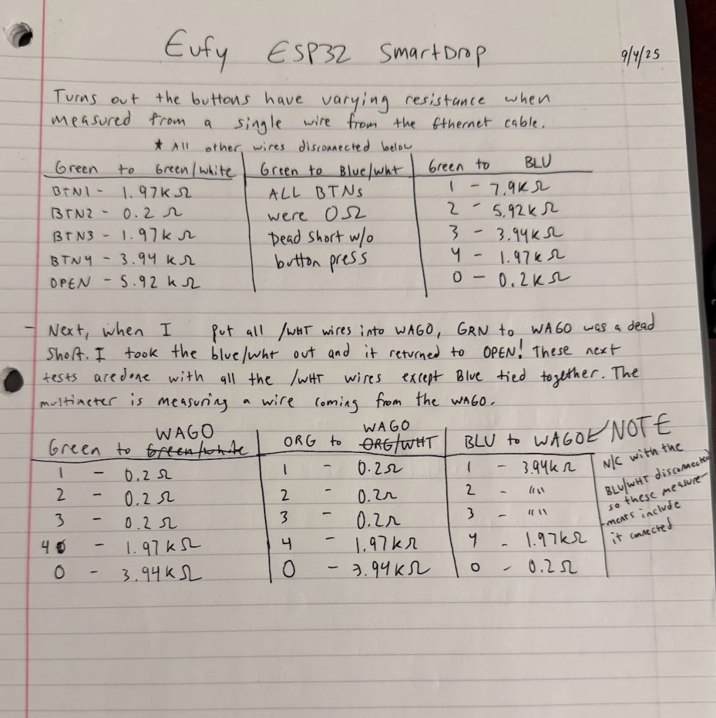 The solder job sort of worked, but not in the way I had hoped. It turns out I had made a small oversight when testing the bare PCB on the bench. I measured across each tactile switch while I pressed it, and I was able to see the switch leads closing. However, what I did not realize at the time is that ALL of the buttons shorted when ANY button was pressed. Or at least it produced low enough resistance to cause my multi-meter to beep, and wouldn’t have worked the way I intended. But, I am persistent, so I started measuring the resistance between pairs of wires as I pressed each button and I was able to find a pair where I could differentiate which button was being pressed by the changing resistance (GRN to BLU). Even better, I thought! It’s so simple, it’s perfect! The hand written notes from that effort below:
